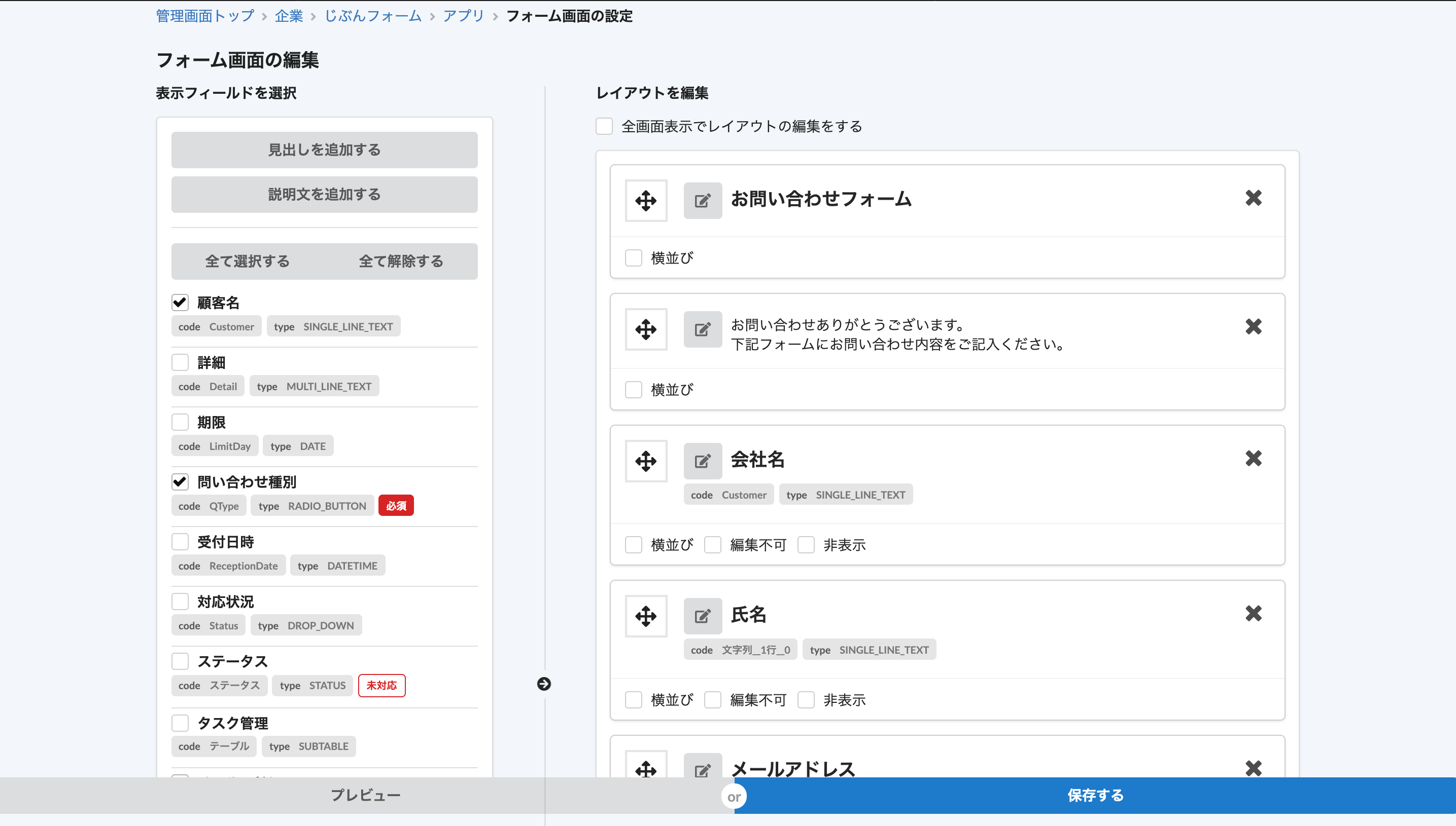 - 「見出し」や「説明文」の追加やフィールドの「編集不可」設定が出来ます
