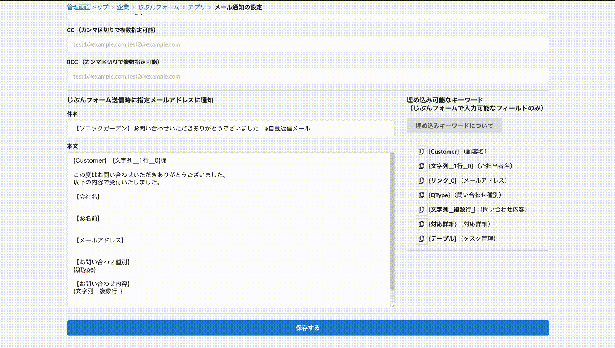 本文やタイトルにはフォームで登録した値を利用することも可能です。