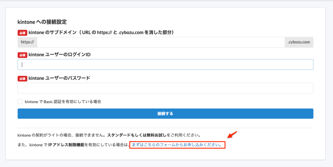 接続設定画面にあるお申込みフォームからご利用いただけます。
