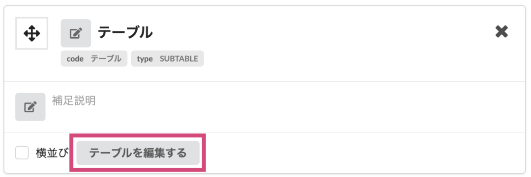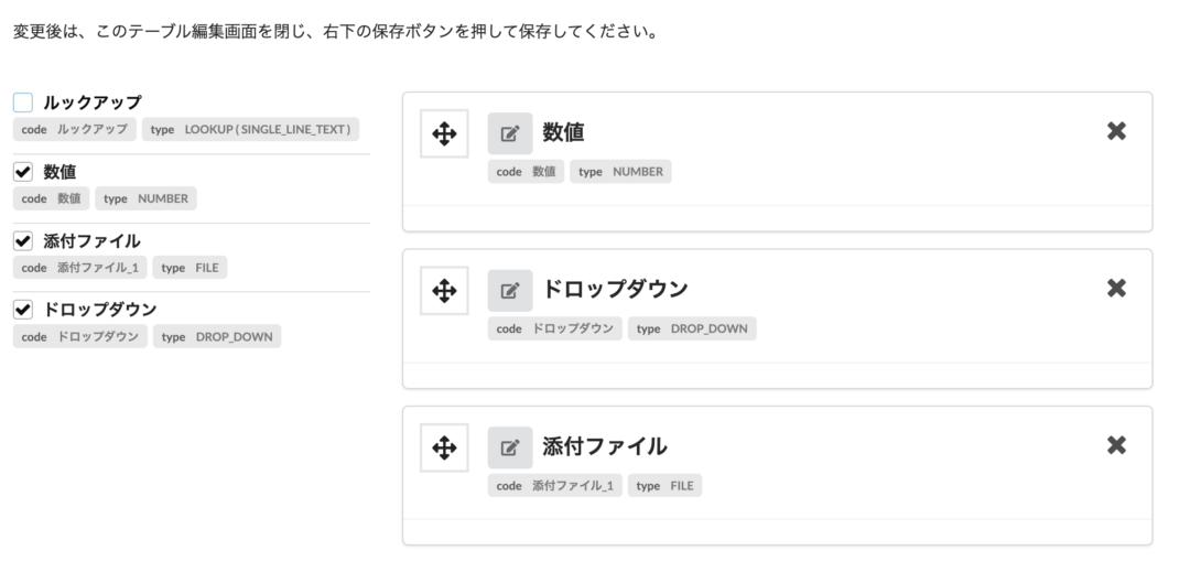 ② テーブルの設定にて、対象のフィールドにチェックが入っているかどうか