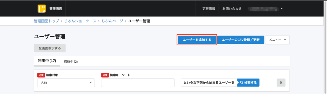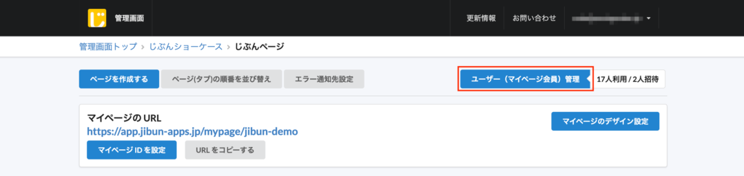 ①じぶんページの管理画面から、画面右上の「ユーザー(マイページ会員)管理」をクリック