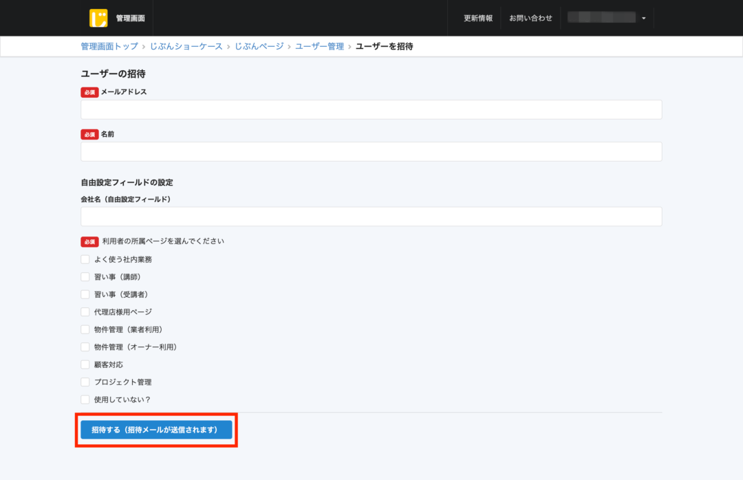 ③メールアドレス、名前、自由設定フィールド(任意)を入力し、利用者の所属ページを選択したら、「招待する」をクリック