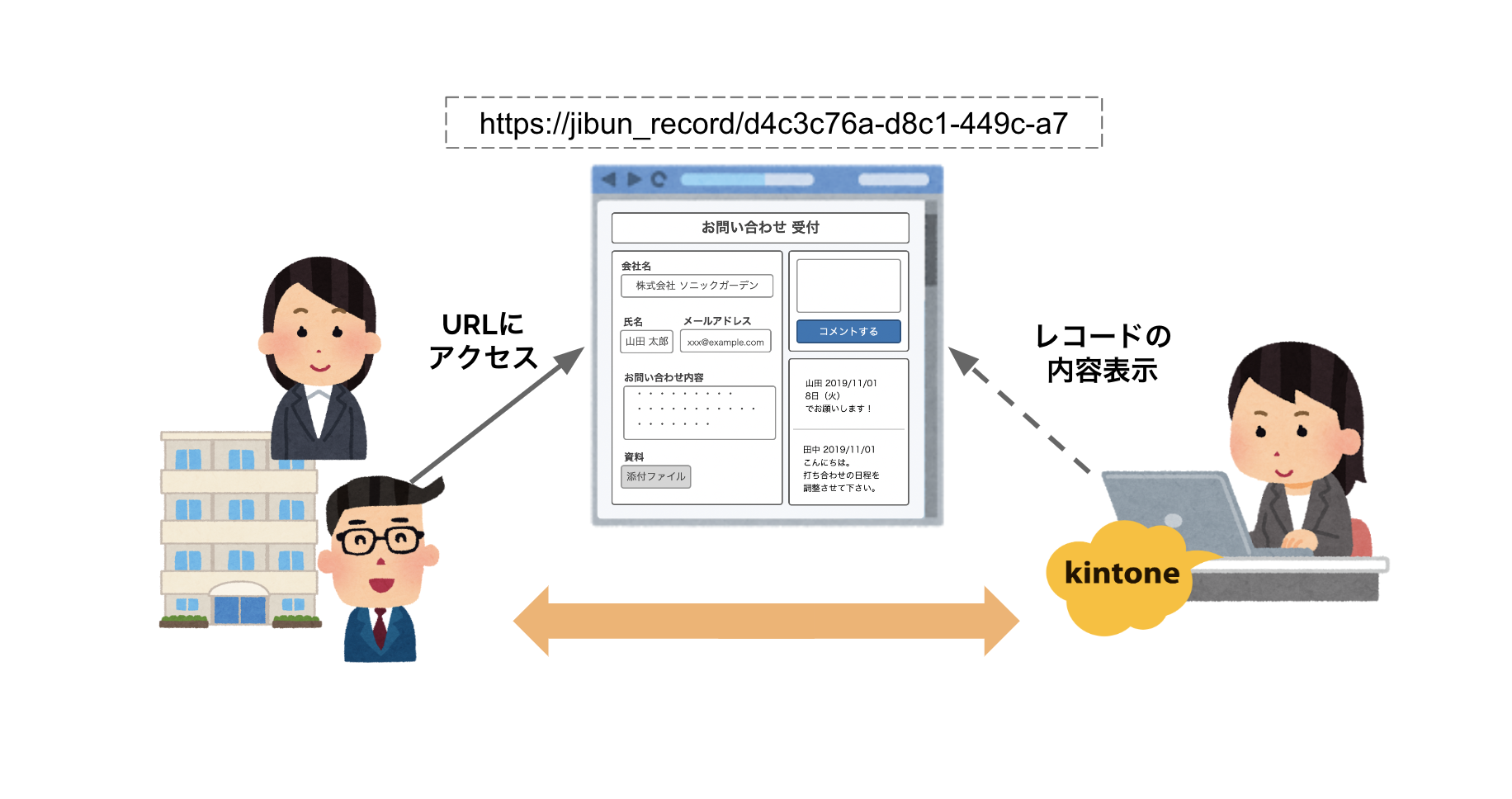 kintoneのアカウントを持っていなくても、レコード情報を閲覧できるだけでなく、編集やファイル添付、コメント等も可能です。