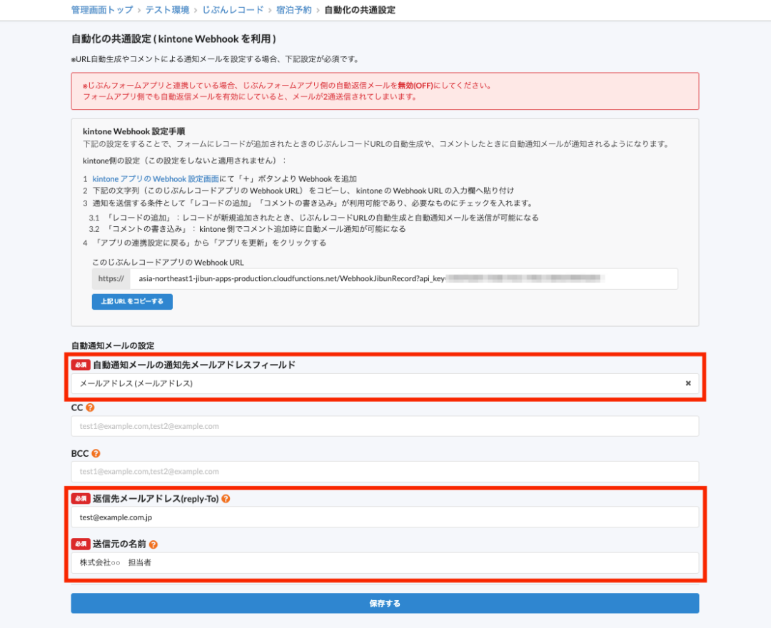 また「返信先メールアドレス(reply-To)」にお客様が自動返信メールに対して返信する際の宛先(会社のアドレス等)、「送信元の名前」に自動返信メールの送信元として表示したい名前を記入後保存します。